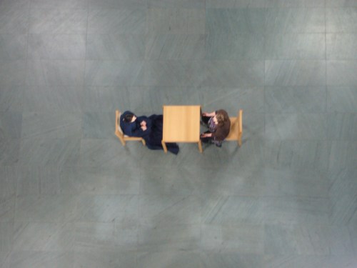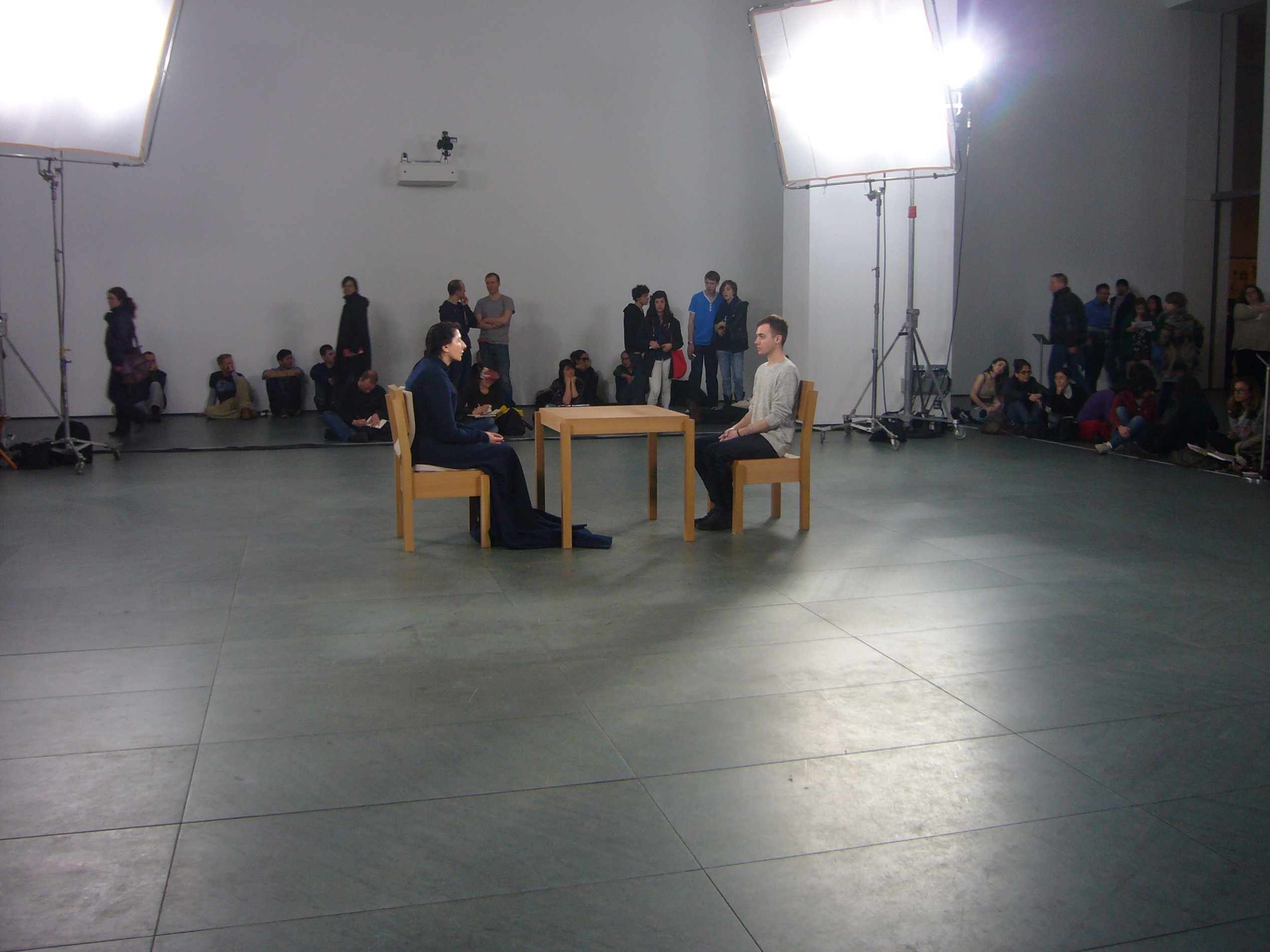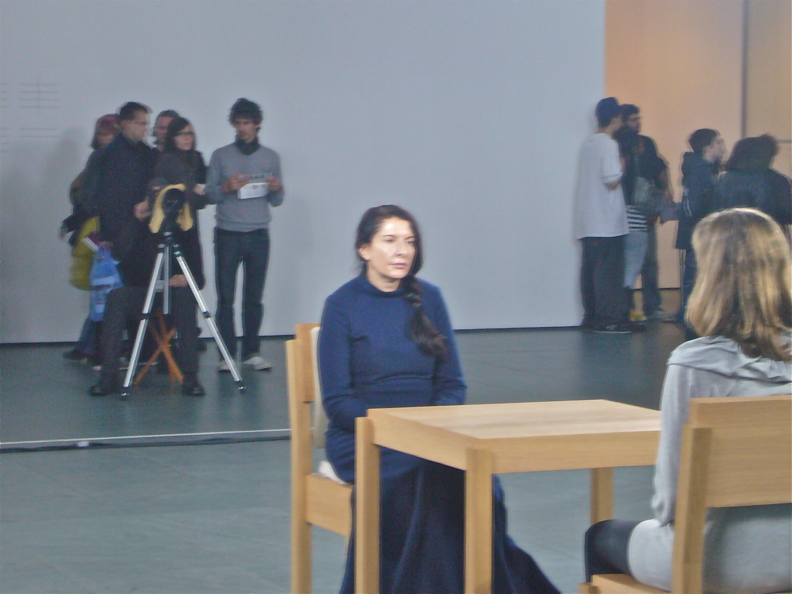 Quelques photos prises à New York en mars dernier au musée d’art moderne, le MoMa, où l’on présente jusqu’à la fin du mois de mai l’exposition «The artist is present», une très importante rétrospective consacrée à l’artiste de performance Marina Abramovic. On la voit ici engagée dans la plus longue performance de sa carrière, performance menée de l’ouverture à la fermeture du musée et ce pour toute la durée de l’exposition (du 14 mars au 31 mai). Cette oeuvre d’art a pour objet le sujet qui l’exécute, c’est-à-dire que l’oeuvre d’art se confond ici avec la présence de l’artiste, présence physique et silencieuse. Le visiteur qui le souhaite (et qui aura la patience d’attendre son tour) est donc invité à s’assoir devant cet être-là pour le temps qu’il veut, à être là à regarder l’oeuvre qui en retour le regarde la regarder… Croiser ainsi le regard installe les participants dans une sorte de gravité de laquelle il semble difficile de s’extraire, on racontait en effet qu’un homme la veille a passé toute la journée dans les yeux de Marina Abramovic! Pendant les heures d’ouverture du musée on peut voir en ligne et en direct le déroulement de la performance. On peut voir aussi la photo de chacun des visiteurs ayant à ce jour participé à la performance, ils sont plus de 800, mais le plus beau c’est la trace que l’émotion laisse sur ces visages transfigurés…