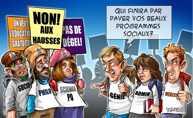 Ce soir on a entendu parlé aux nouvelles d’un groupe d’étudiants qui entend militer en faveur de la hausse des frais de scolarité. Je ne serais pas surpris d’apprendre qu’ils en sont à leur dernière session et que leur mouvement s’appelle «Après moi le déluge». Je plaisante, ils ont peut-être des arguments qui méritent d’être entendus. Mais tandis que je demandais à quoi ils pouvaient bien ressembler, Samuel Landry m’a fait parvenir une image d’eux croquée sur le vif