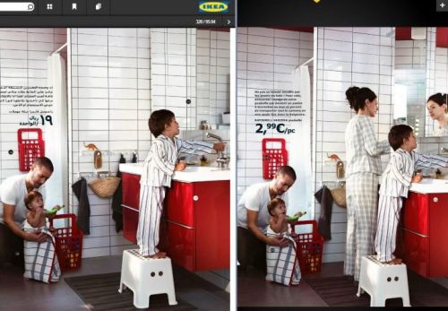 Les clichés sont identiques à un détail près : les femmes ont été effacées dans le catalogue distribué en Arabie saoudite. Par exemple, la mère de deux enfants se mirant dans une glace HOVET est absente de la version saoudienne.