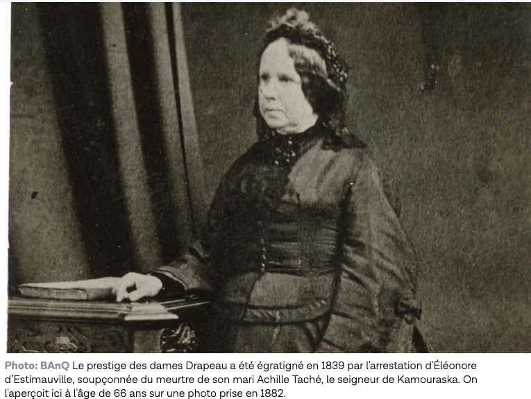 Ce fait divers concerne Éléonore d’Estimauville, la fille de l’une des dames Drapeau. En 1839, la jeune femme de 23 ans est soupçonnée d’avoir comploté pour assassiner son époux violent, Achille Taché, le seigneur de Kamouraska. Sa culpabilité ne fait pas de doute aux yeux de Raphaël Bergeron-Gauthier. « Elle l’a fait tuer », lance-t-il spontanément en évoquant le témoignage incriminant de sa servante. L’assassin n’est nul autre que l’amant d’Éléonore, George Holmes, qui s’enfuit aux États-Unis au terme de sa virée sanglante en carriole.»