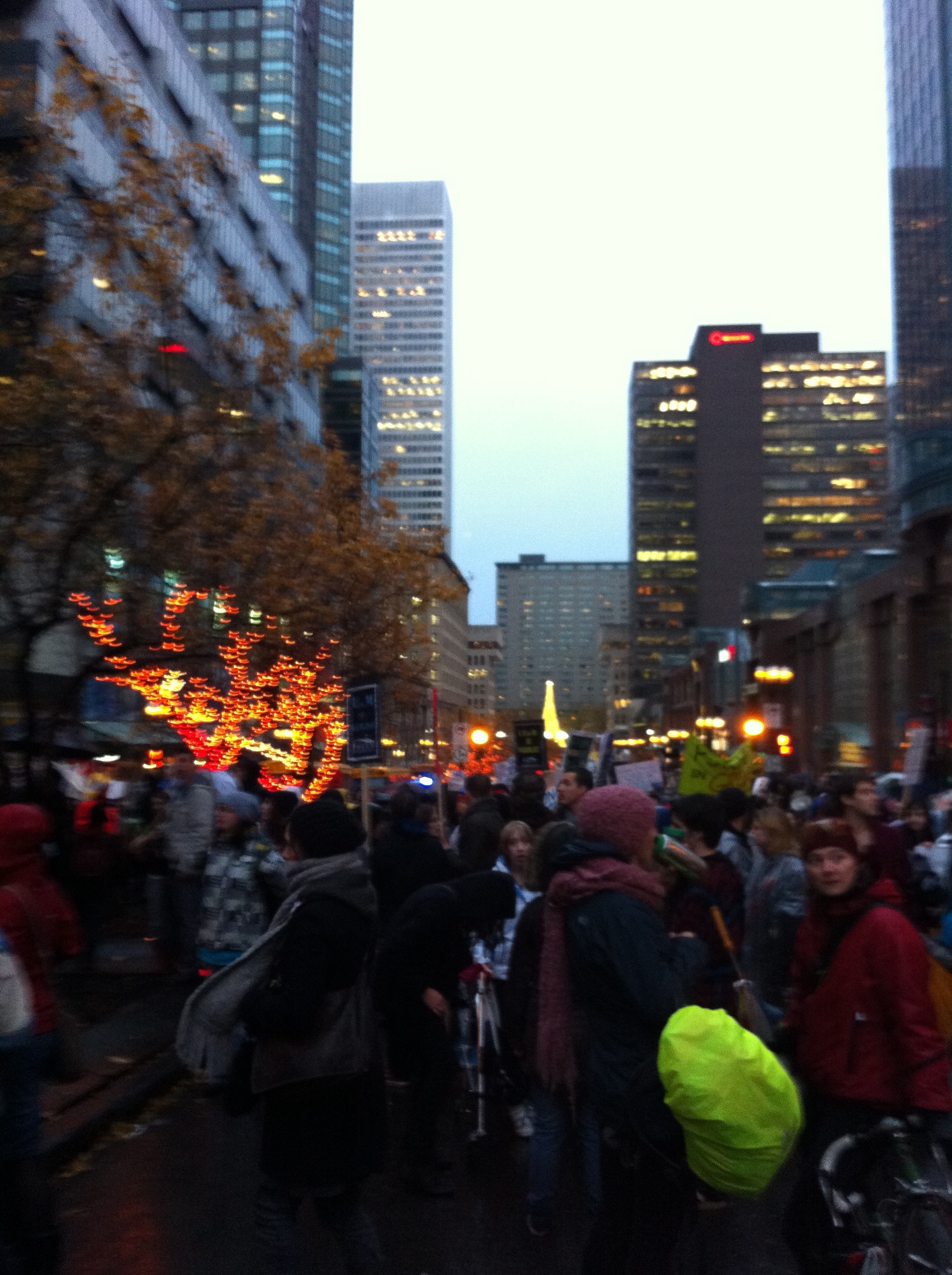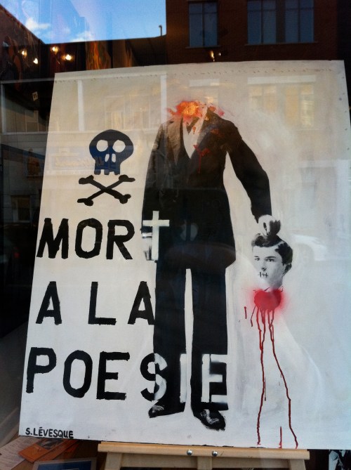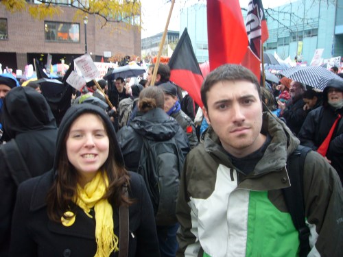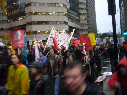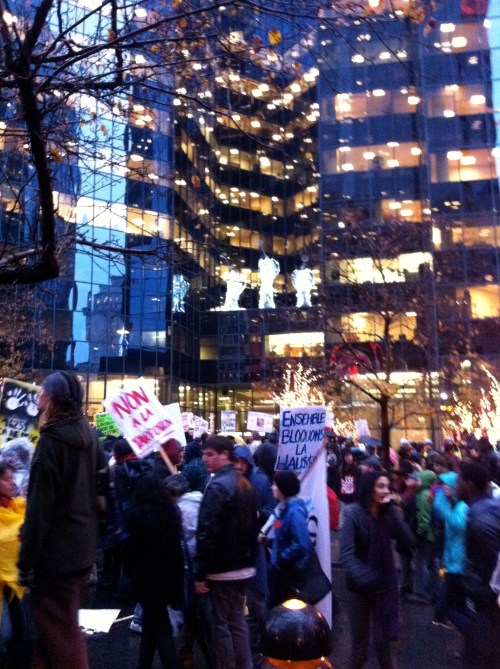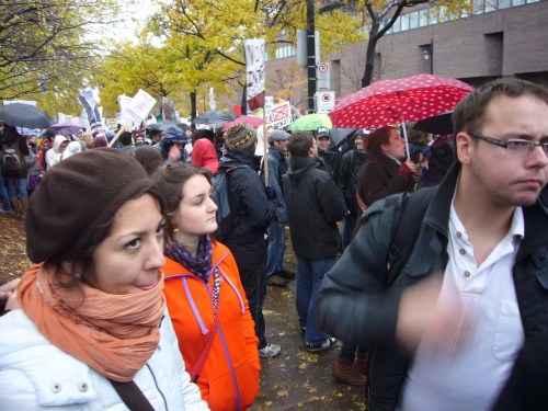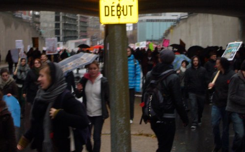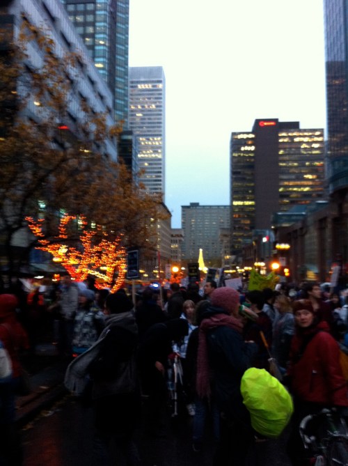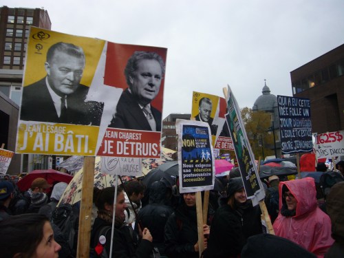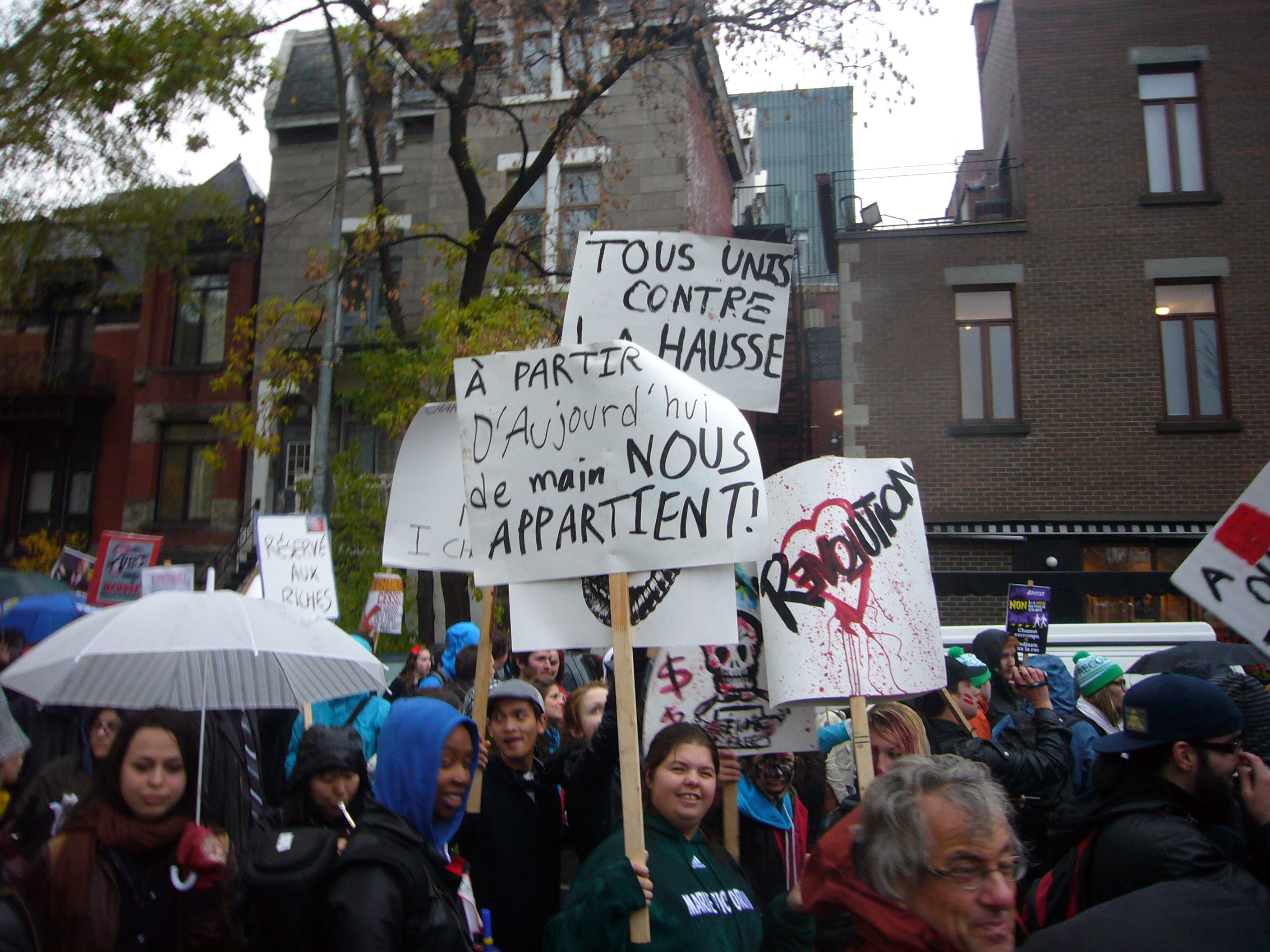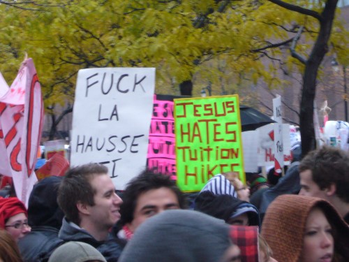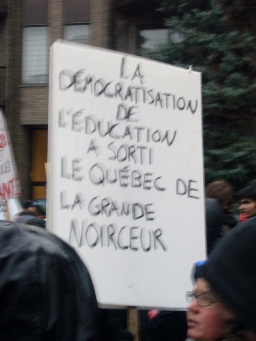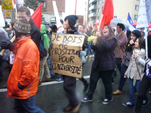 Dans un contexte d’indignation générale (on pense au mouvement «Occupy»), et dans le contexte de la lutte contre la hausse des frais de scolarité qui sévit depuis plus d’un an maintenant, dont nous sommes tous victimes, je ne peux que remarquer l’incroyable désolidarisation entre les hommes, tous sexes confondus. Certes, ce n’est pas face à une guerre qu’on se retrouve… peut être est-ce pire ? Ce n’est pas des fusils qu’on pose sur nos tempes, mais peut-être que les gros banquiers et l’État prônant l’élitisme devrait commencer, pour nous dégrouiller un peu ?