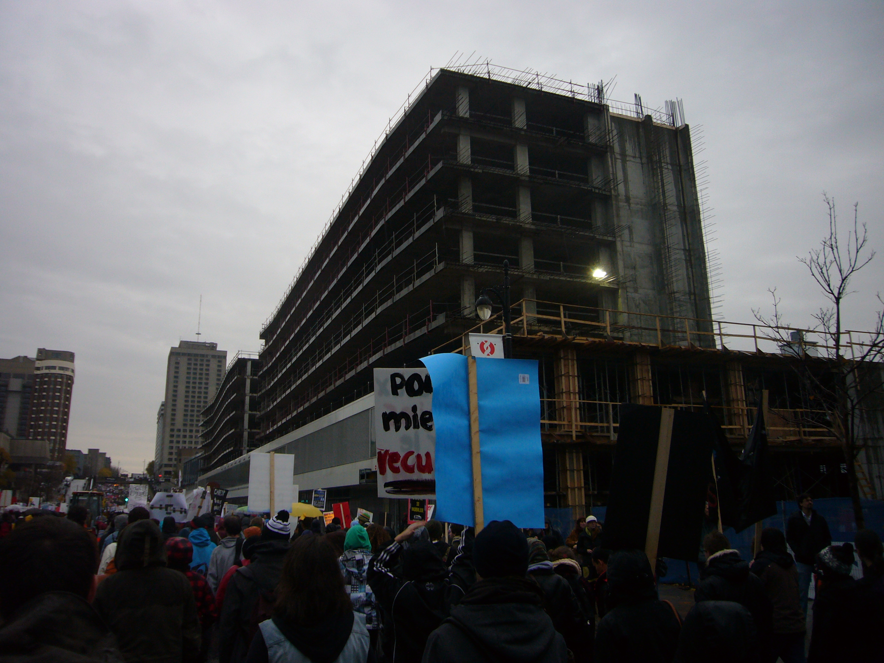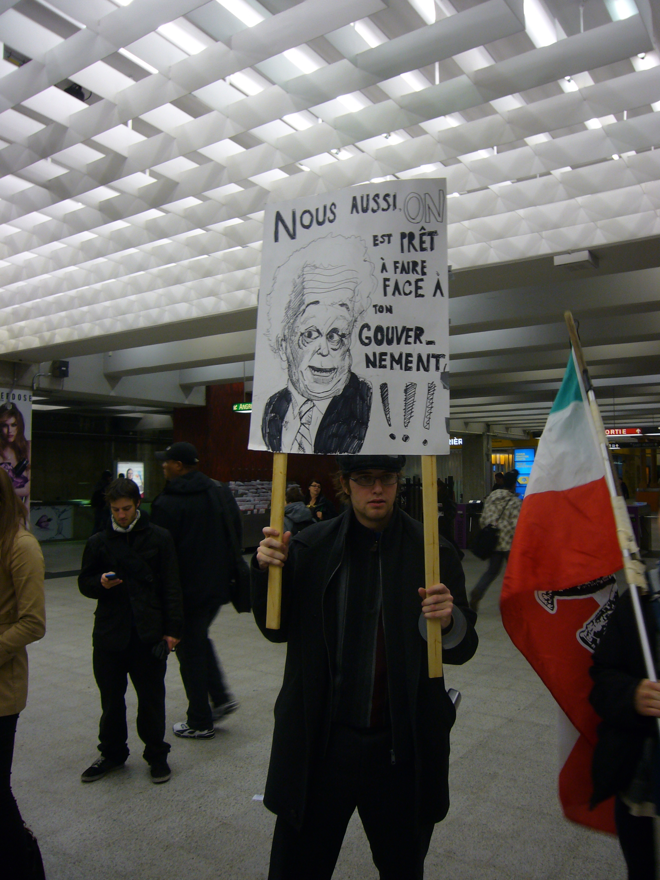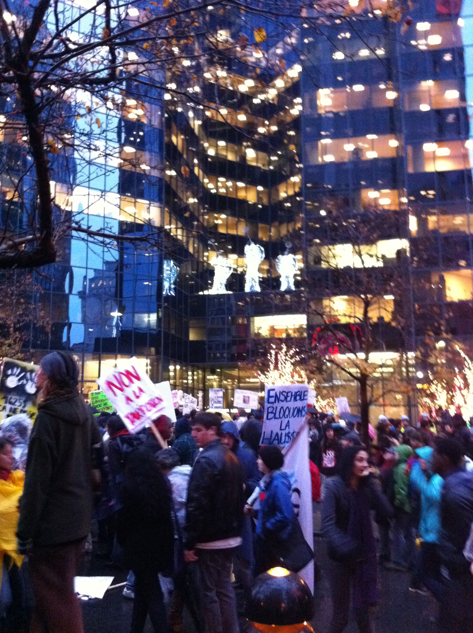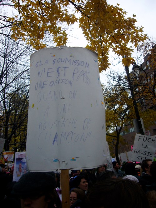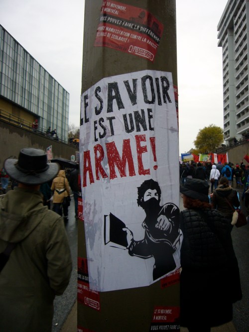 Là où je veux en venir, c’est que me lever et vivre ces évènements, c’est dur. Je suis imprégnée de la philosophie sartrienne depuis le début de ma session, suivant un cours tout à fait admirable sur ce dernier. Cette philosophie de l’engagement arrive juste à point alors qu’en tant qu’étudiante, je suis en plein lutte pour conserver l’accessibilité aux études supérieures pour moi et mes concitoyens. Peut-être devrais-je juste penser « Québec », mais Sartre parle de l’homme comme étant pareil à tout homme. La liberté devient nécessairement la valeur suprême. Ainsi, je ne dois pas penser à mes amis québécois, et mes peut-être futurs enfants québécois. Je dois lutter contre la hausse des frais, car elle brime nos libertés, liberté souveraine du droit d’apprendre et de s’instruire, non ? Et du même fait, les hommes d’Iran qui saccagent violemment leur Ambassade anglaise, me font violence à moi. Pas juste à moi, si vous avez compris.