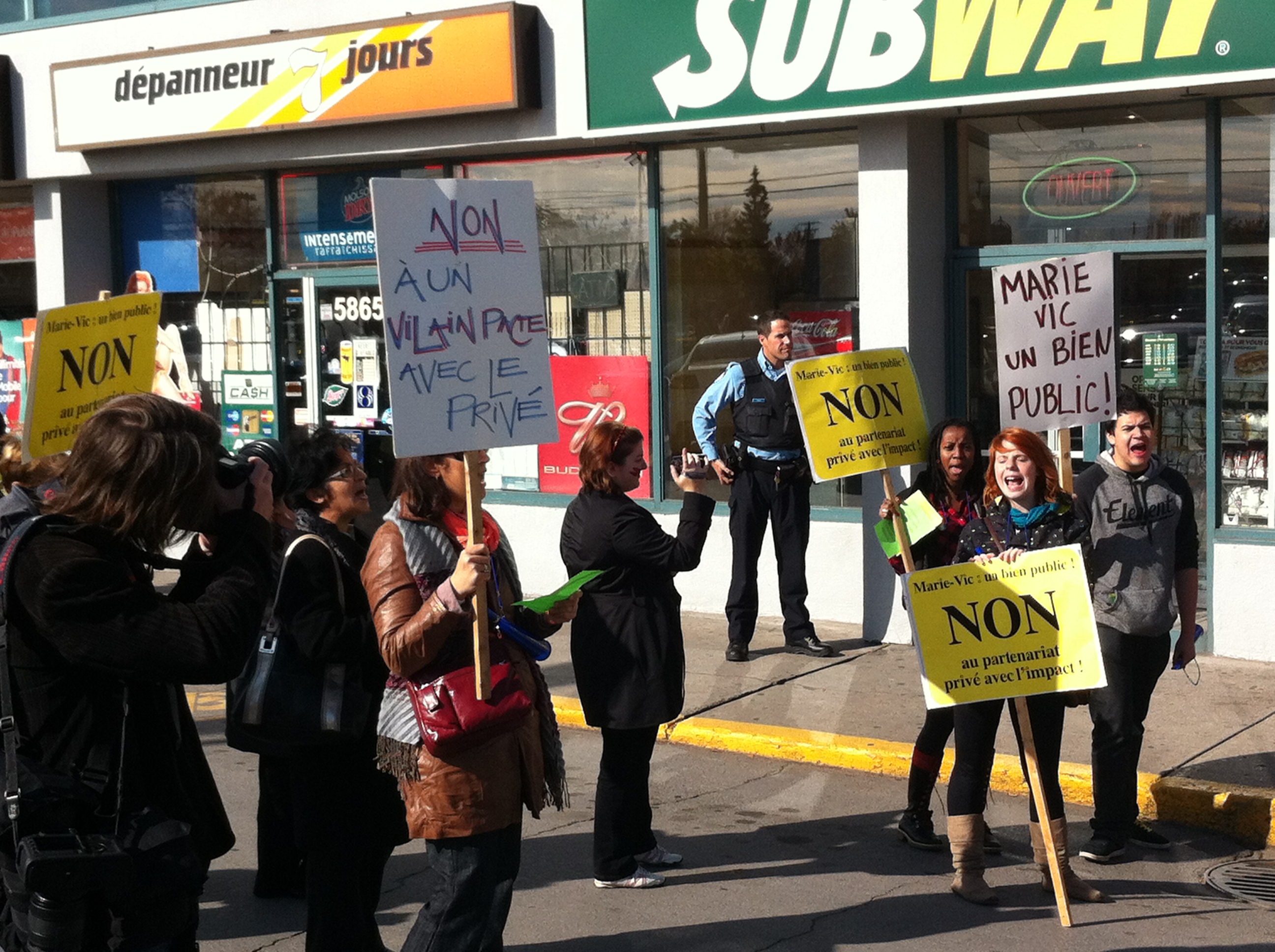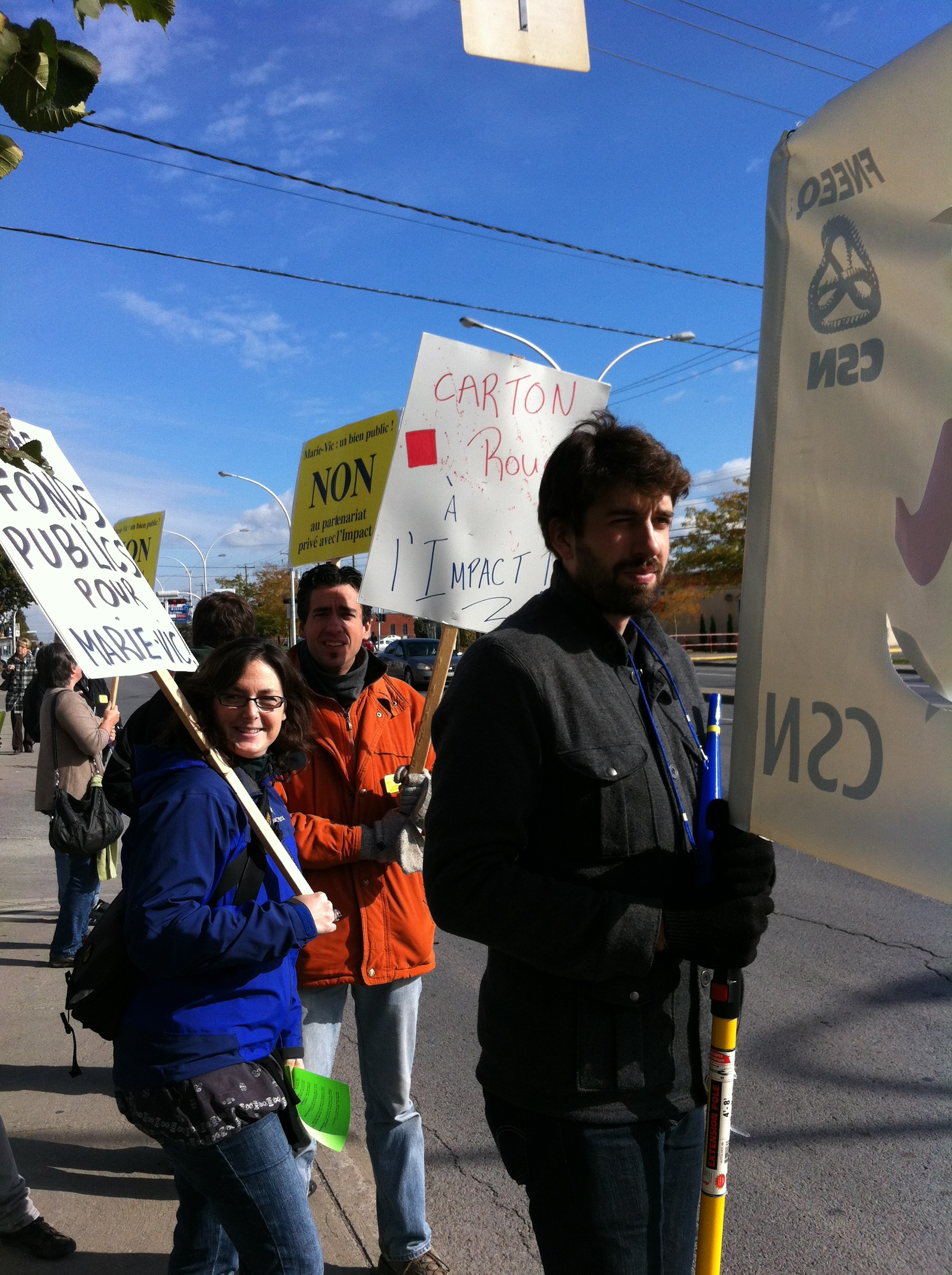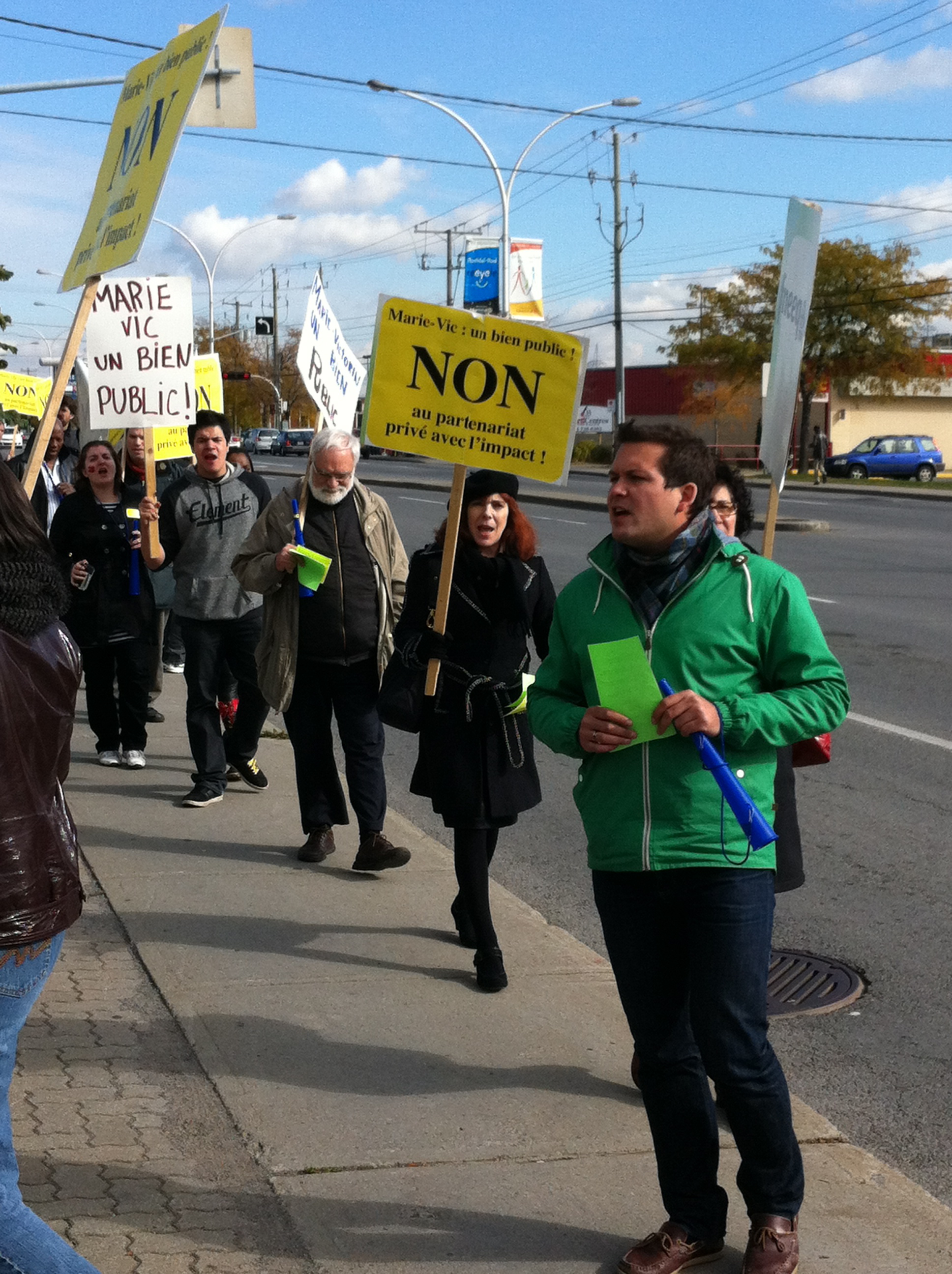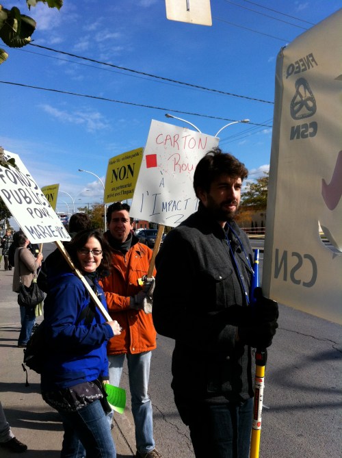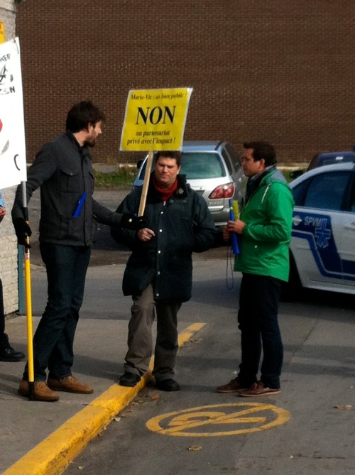 Le mercredi 26 octobre, devant le bureau de comté de la députée de Bourassa-Sauvé, Line Beauchamp Ministre de l’éducation du sport et du loisir, professeurs et étudiants du Cégep Marie-Victorin ont de nouveau manifesté leur opposition au projet de «partenariat» entre le cégep, institution publique qui poursuit une mission éducative, et le club de soccer l’Impact, entreprise privée qui poursuit son seul profit. Véritable marché de dupes en PPP où le cégep, bien public, cèderait à l’entreprise privée la quasi totalité de ses terrains en échange d’une seule bâtisse. Ce qui, à toutes fins utiles, viendrait sceller toutes possibilités de développement futurs pour le cégep, en plus de priver la communauté de Montréal nord de précieuses installations sportives, nos terrains offerts aux diverses organisations sportives publiques. Engager notre collège dans une telle transaction équivaut à dévoyer sa mission première: éduquer et servir le public qui en est le seul propriétaire légitime. Il faut donc s’opposer à ce projet, rendons-nous en grand nombre au conseil d’administration le 9 novembre!