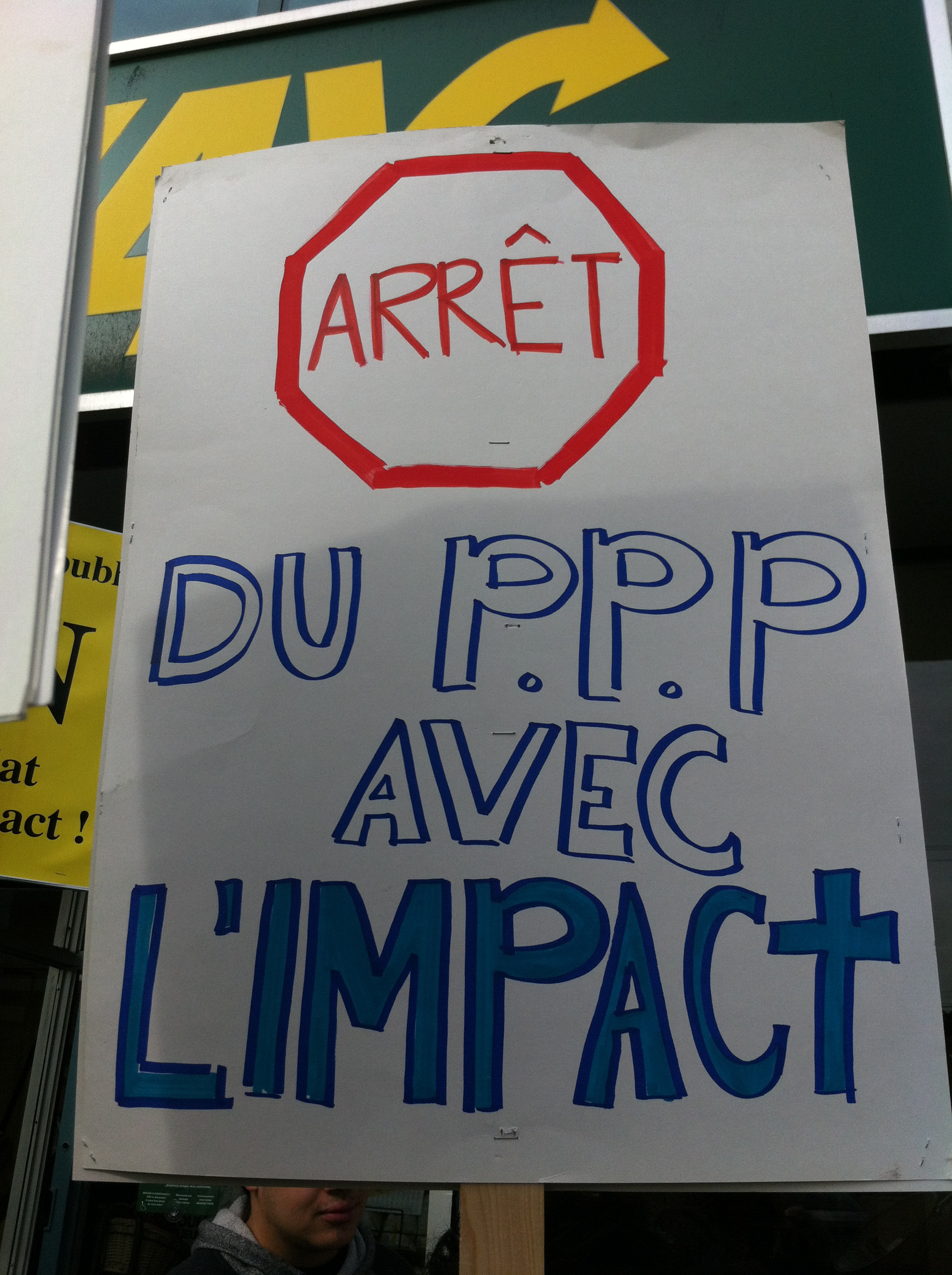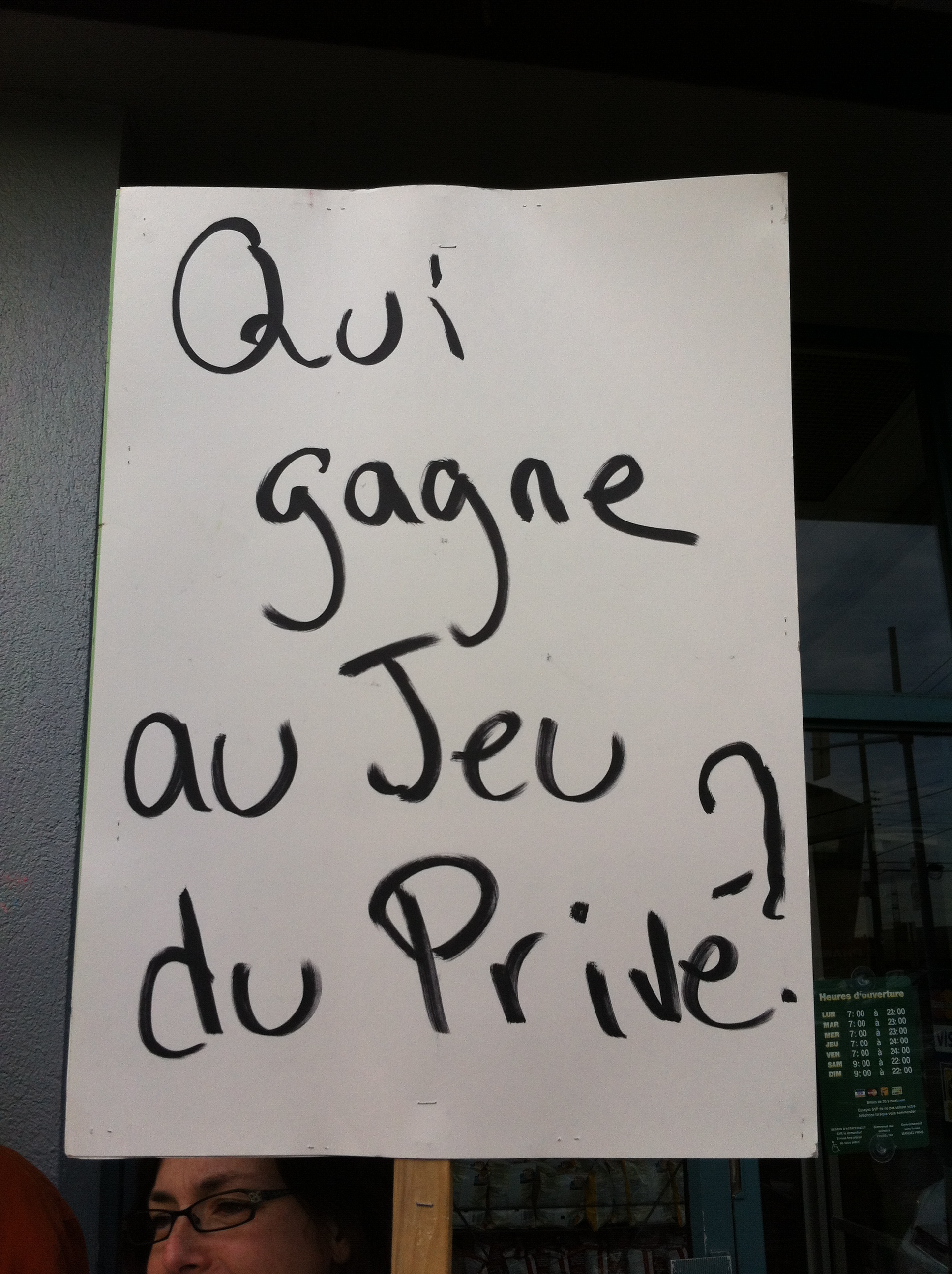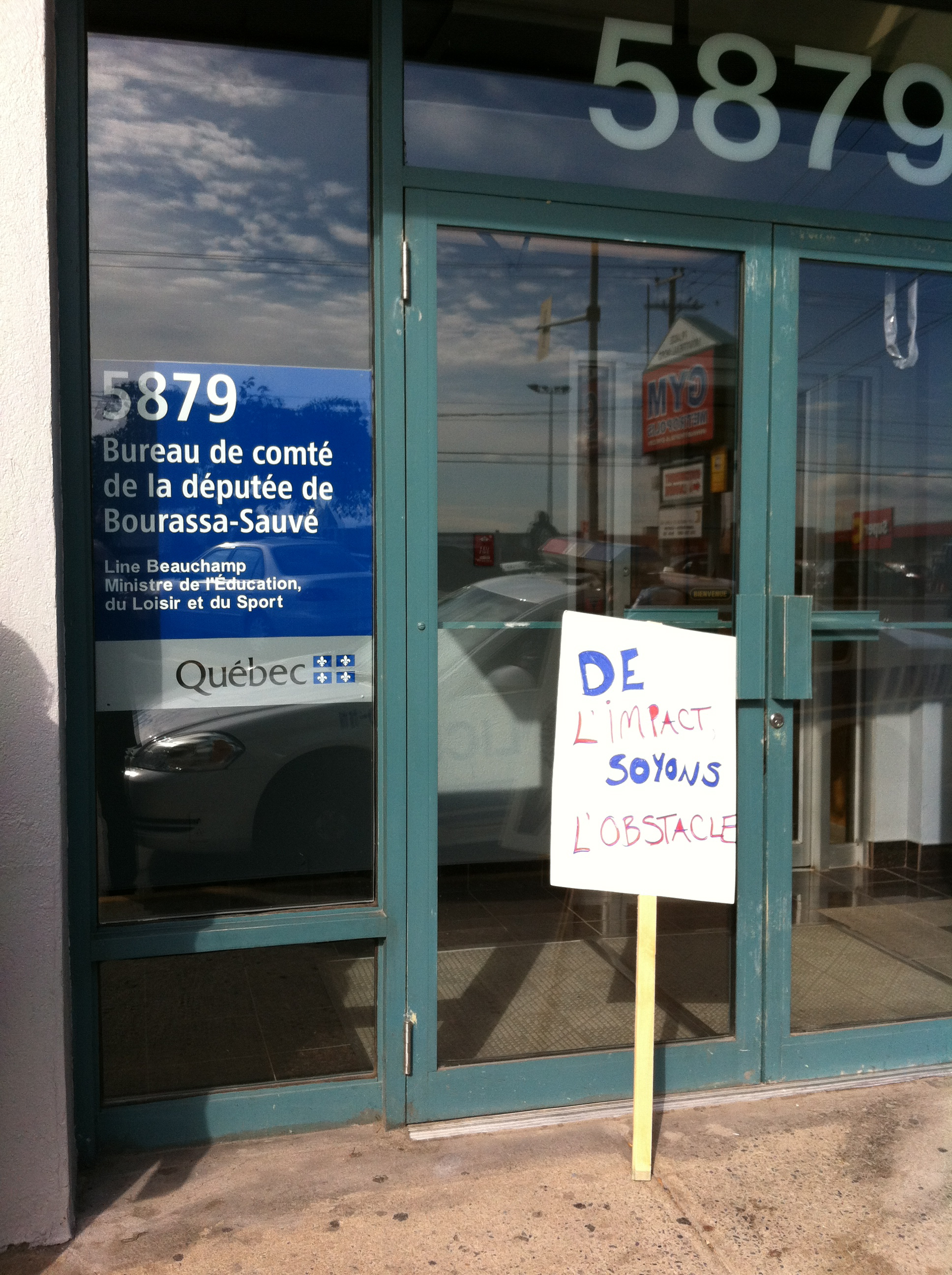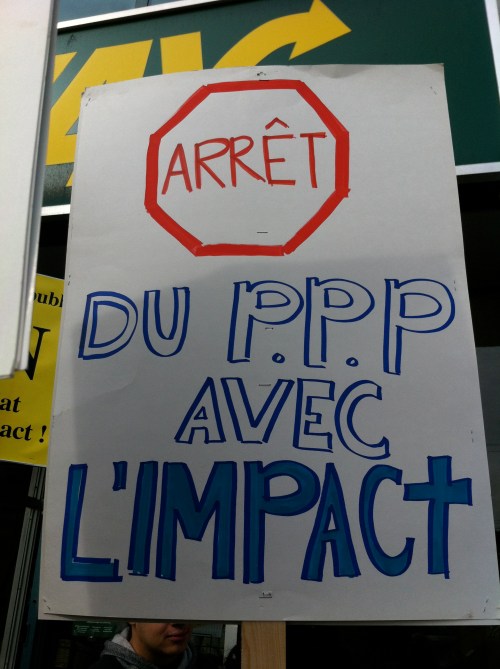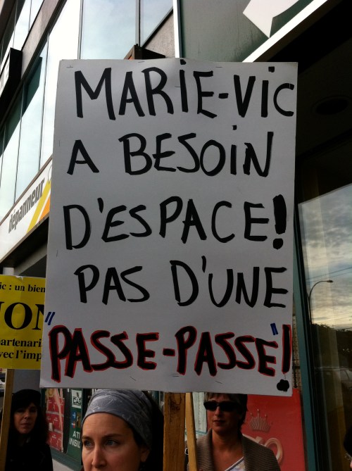 Le mercredi 26 octobre, devant le bureau de comté de la députée de Bourassa-Sauvé, Line Beauchamp Ministre de l’éducation du sport et du loisir, professeurs et étudiants du Cégep Marie-Victorin ont de nouveau manifesté leur opposition au projet de «partenariat» entre le cégep, institution publique qui poursuit une mission éducative, et le club de soccer l’Impact, entreprise privée qui poursuit son seul profit. Véritable marché de dupes en PPP où le cégep, bien public, cèderait à l’entreprise privée la quasi totalité de ses terrains en échange d’une seule bâtisse. Ce qui, à toutes fins utiles, viendrait sceller toutes possibilités de développement futurs pour le cégep, en plus de priver la communauté de Montréal nord de précieuses installations sportives, nos terrains offerts aux diverses organisations sportives publiques. Engager notre collège dans une telle transaction équivaut à dévoyer sa mission première: éduquer et servir le public qui en est le seul propriétaire légitime. Il faut donc s’opposer à ce projet, rendons-nous en grand nombre au conseil d’administration le 9 novembre!
