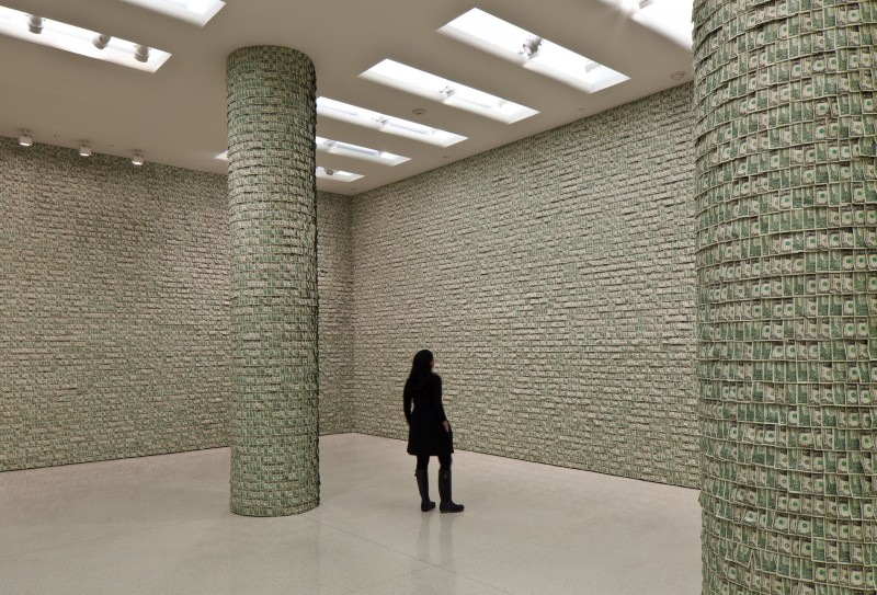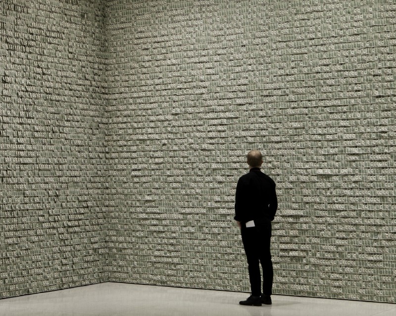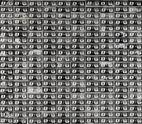 47 ans plus tard, en 2009, ce tableau a été vendu aux enchères chez Sotheby’s pour la somme de $43.7 millions de dollars. On voit bien, c’est évident, que Hans-Peter Feldmann s’en est inspiré et qu’il a certainement voulu réalisé en trois dimensions ce que Warhol avait fait en deux dimensions. Cette même année, en 1962, Warhol a décidé de ne plus être un artiste «commercial» qui travaillait principalement pour des magazines de mode et des agences de publicité. Il a donc cherché à présenter ses oeuvres dans des galeries pour qu’elles soient achetées par des collectionneurs importants. Mais très anxieux quant à savoir quoi peindre, Warhol harcelait ses amis pour qu’ils lui donnent des idées et l’un deux, Henry Geldzahler qui allait devenir un important commissaire au Metropolitan Museum, lui suggéra de peindre les objets familiers que les gens ordinaires consomment. Voilà pour les bouteilles de Coca-Cola et les boites de soupes Campbell. Mais c’est une autre amie, Muriel Latow, qui lui conseilla de peindre ce que tout le monde recherche par dessus tout: l’amour? Non, l’argent! C’est ainsi qu’Andy Warhol débuta comme artiste, en imprimant de l’argent, ce qui allait lui permettre de gagner beaucoup d’argent…