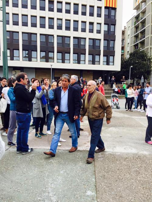 Autour de 9h15, inquiétude généralisée parmi les personnes attroupées devant le bureau de vote où nous étions. On apprend que le bureau de vote voisin, à seulement quelques centaines de mètres, a été rapidement fermé par la Guardia, qui a tassé et tabassé des gens, fracturé le bras d’une dame et saisi les urnes. Aussitôt, la tension monte parmi la file, et les Catalan.es présent.es forment une ligne, avec la mairesse de la ville et les hommes devant pour protéger leur démocratie. L’inquiétude et la colère sont palpables parmi les gens ne désirant que voter. Rapidement, les images de la fermeture violente des bureaux de vote à Gérone et à Barcelone circulent sur les réseaux sociaux, et des murmures d’incompréhension circulent parmi les personnes présentes. Une dame appelle quelqu’un en pleurant. Colère et indignation.